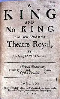 The play was entered into the Stationers' Register on 7 August 1618.[1] The first edition was the 1619 quarto issued by the bookseller Thomas Walkley, who would publish Philaster a year later. A second quarto appeared in 1625, also from Walkley; subsequent quarto editions followed in 1631 (from Richard Hawkins), 1639, 1655, 1661, and 1676 (all from William Leake), and 1693.[2] Like other previously-printed Beaumont and Fletcher plays, A King and No King was omitted from the first Beaumont and Fletcher folio of 1647, but was included in the second of 1679.