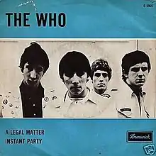 "A Legal Matter" is a song written by Pete Townshend and recorded by the British rock band the Who for their debut album My Generation. It was recorded on 12 October 1965 at IBC Studios, and released both as the B-side to "The Kids Are Alright" in the U.S., and as the A-side of a single that reached number 32 in the UK. Both singles were released by Shel Talmy without the permission of the Who[2][3] and were a result of a legal dispute between Talmy and the band at the time and an attempt to sabotage the release of the band's chosen single "Substitute".[4]