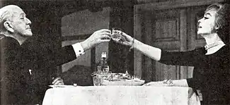 The play was first produced at the Queen's Theatre, London on 14 April 1966, directed by Vivian Matalon.[2] Suite in Three Keys was planned by Coward as his theatrical swan song: "I would like to act once more before I fold my bedraggled wings."[1] Coward's previous play, Waiting in the Wings (1960), had not been a critical success, but the climate of opinion had changed in the intervening six years, and Coward's works had undergone a period of rediscovery and re-evaluation, which Coward called "Dad's Renaissance". This had begun with a successful revival of Private Lives at the Hampstead Theatre and continued with a new production of Hay Fever at the National Theatre.[1] His co-stars in A Song at Twilight were Lilli Palmer (Carlotta), Irene Worth (Hilde) and Sean Barrett (Felix).[3]