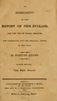 Adams published in 1805 An abridgement of the history of New-England, for the use of young persons (B. & J. Homans, and John West. A. Newell, printer; Boston). The later work retained the most important parts of the Summary History. In twenty chapters, she comprised the substance of her first book. Long accounts of polemic divinity, which might not be read by the young, nor understood by the old, were omitted, and greatly abbreviated the story of the American Revolutionary War. She improved her work by means of later writers, and particularly by John Marshall's life of George Washington. The paragraphs were numbered, and the form and size of the book were well-suited to the use of children. It was said by Munroe & Francis (1895) that Adams possessed uncommon acuteness in discovering the repositories of knowledge adapted to her purpose, and a facility in using it.[1]