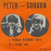 "A World Without Love" is a song originally recorded by the British duo Peter and Gordon and released as their first single in February 1964. It was included on the duo's debut album in the UK, and in the US on an album of the same name. The song was written by Paul McCartney[3] and attributed to Lennon–McCartney.[4] The B-side was "If I Were You", written by Peter and Gordon.[5]