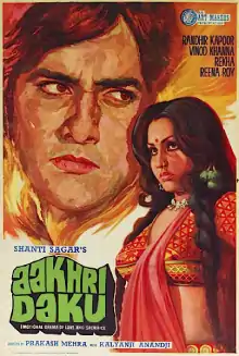 Aakhri Daku (transl.โ€‰The last dacoit) is a 1978 Hindi movie produced by Surendra Pal Bhalla and directed by Prakash Mehra.[1] The film stars Randhir Kapoor, Vinod Khanna, Rekha, Reena Roy, Sujit Kumar, Ranjeet, Keshto Mukherjee and Paintal. The music to the film is by Kalyanji-Anandji.[2]