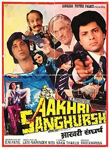 Aakhri Sanghursh is a Hindi action film of Bollywood directed by Narendra Bedi and produced by G. M. Patel. The film stars Vijayendra Ghatge, Kajal Kiran, Mukesh Khanna in the key roles. This film was made in 1982 and was ready to be released in 1986, but due to some unknown reasons, the film was finally released in 1997 in the banner of G. M. Productions and Jawahar Picture Palace.[1][2]