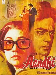 Aandhi (transl. 'Storm') is a 1975 Indian political drama film starring Sanjeev Kumar and Suchitra Sen, and directed by Gulzar. At the time it was alleged that the film was based on the life of the then-Prime Minister Indira Gandhi and her relationship with her estranged husband, but in reality, only the look was inspired by the politician Tarkeshwari Sinha and Indira Gandhi.[1] The story is based on a chance meeting of an estranged couple after several years, when wife Aarti Devi, now a leading politician happens to stay in the hotel run by her husband during an election campaign.[2] The movie is noted for its songs composed by Rahul Dev Burman, written by Gulzar and sung by Kishore Kumar and Lata Mangeshkar.
