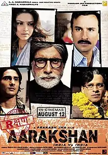 Aarakshan (transl.'Reservation') is a 2011 Indian Hindi-language drama film starring Amitabh Bachchan, Saif Ali Khan, Manoj Bajpayee, Deepika Padukone, and Prateik Babbar. Directed by Prakash Jha, the film is a socio-political drama based on the controversial policy of caste based reservations in Indian government jobs and educational institutions. The film was released on 12 August 2011 to mostly mixed reviews. It was a Below Average at the box office.
