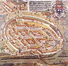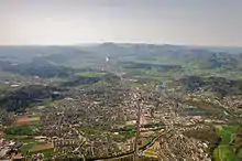 The old city of Aarau is situated on a rocky outcrop at a narrowing of the Aare river valley, at the southern foot of the Jura mountains.[7] Newer districts of the city lie to the south and east of the outcrop, as well as higher up the mountain, and in the valley on both sides of the Aare. The neighboring municipalities are Küttigen to the north and Buchs to the east, Suhr to the south-east, Unterentfelden to the south, and Eppenberg-Wöschnau and Erlinsbach to the west. Aarau and the nearby neighboring municipalities have grown together and now form an interconnected agglomeration. The only exception is Unterentfelden whose settlements are divided from Aarau by the extensive forests of Gönhard and Zelgli. Approximately nine-tenths of the city is south of the Aare, and one tenth is to the north. It has an area, as of 2006, of 8.9 km2 (3.4 sq mi). Of this area, 6.3% is used for agricultural purposes, while 34% is forested. Of the rest of the land, 55.2% is settled (buildings or roads) and the remainder (4.5%) is non-productive (rivers or lakes).[8] The lowest elevation, 365 meters (1,198 ft), is found at the banks of the Aar, and the highest elevation, at 471 meters (1,545 ft), is the Hungerberg on the border with Küttigen.