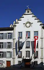Aarau (Swiss Standard German: [ˈaːraʊ], Alemannic German pronunciation: [ˈɑːræu̯]) is a town, a municipality, and the capital of the northern Swiss canton of Aargau. The town is also the capital of the district of Aarau. It is German-speaking and predominantly Protestant. Aarau is situated on the Swiss plateau, in the valley of the Aare, on the river's right bank, and at the southern foot of the Jura Mountains,[3] and is west of Zürich,[4] 58 kilometres (36 mi) south of Basel and 65 kilometres (40 mi) northeast of Bern.[5] The municipality borders directly on the canton of Solothurn to the west. It is the largest town in Aargau. At the beginning of 2010 Rohr became a district of Aarau.[6]