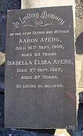 - 1 2 "Death of Mr Aaron Ayers". The Press. Vol. LVII, no. 10762. 15 September 1900. p. 8. Retrieved 26 April 2012.