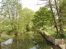 In 1809 the millers, in concert with City of London Corporation, offered the stream as the Thames navigation channel by building a weir to protect Chertsey, Shepperton, and other areas downstream from floods, as well as keeping water levels sufficiently deep, but the latter decided to pursue its own shorter route plans, so built Chertsey Weir and Lock.[7] Much of the channel is lightly surrounded by trees and it is, at most, 980 m (3,220 ft) from the River Thames.[8]