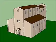 The church ended in the east with the presbytery and altar and was probably triapsidal in the same way as the monastic churches of Desiderian foundation, such as San Salvatore in Brescia or San Salvatore in Sirmione, and as, on the other hand,[79] the triple dedication of the sacred building to the Savior, Mary, and Archangel Michael suggests.[78] Not demonstrable, but highly probable, is the existence from this early stage of the crypt, sufficiently motivated by the bestowal of important relics and by the likely similarities with the other Desiderian churches mentioned before.[78][80]