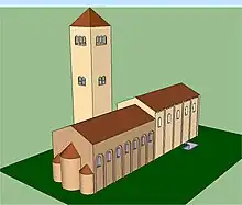 With the building of the second church was also erected, on its southern perimeter side, a massive bell tower that hinted at the plebeian connotations of the monastery, supporting the thesis of the existence of a baptistery.[81][82] Andrea Breda, in 2007, hypothesized, on the basis of the size of the foundations of the bell tower, that it must have been comparable to that of the basilica of San Zeno in Verona.[85] The bell tower, as well as the second church, was, however, short-lived, having already disappeared in the early 12th century with the construction of the large church of Gonterio.[85]