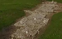 The work of the archaeologists circumscribed to an area of 680 m² and unearthed part of the perimeter wall of the abbey church, distinguished in three phases, the foundations of the crypt, a painted tomb, the base of the ancient bell tower, and a few remains of abbey buildings.[75] To the west of the abbey church, on the other hand, the presence of early medieval structures that can be dated to between the late 4th and 6th centuries was detected by georadar; the new area probably extends outside the area of Villa Badia, below the present parish church, in the area of the ancient castle, and was possibly separated from the monastery by an artificial moat, set up by the abbots to defend themselves from the Hungarians in the 10th century.[76]