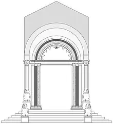 There is no knowledge of the pictorial and stone decorations that once must have adorned the building: the only major fragments that have survived come from the church's main portal or "royal door," carved as part of Gonterio's building site and still intact at the end of the 18th century. The remains consist of part of the lunette above the lintel, conformed in a succession of small arches with a human figure in the center, probably Jesus, and three lions: two of them are now preserved at the entrance to the Leno parish church, while the third, one of the two stylophores that supported the columns of the prothyrum, is inside the town hall of the town.[86][35]