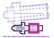 In 1055, Raoul de Tancarville or Raoul-le-Chambellan installed a community of canons in the small funeral chapel, 15.50 m long by 7.50 m wide. The chapel became too small for the community, the collegiate church, dedicated to Saint George, was built on the site of the temple and the fanum, its choir with a flat apse is under the current chapter house and it had a small cloister. A charter-sign of 1080 describes the works with precision.
