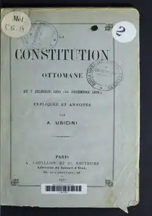 - On the Ottoman Constitution: Ubicini, Abdolonyme (1877). La constitution ottomane du 7 zilhidjé 1293 (23 décembre 1876) Expliquée et Annotée par A. Ubicini. Paris: A. Cotillon et Co.. - PDF file