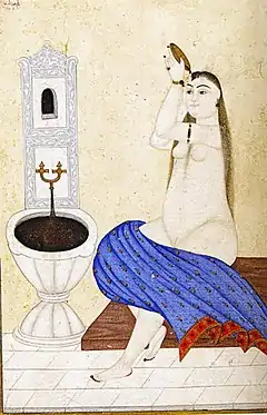 One of his best known miniatures depicts a nude woman at the bath. Seated on a wooden bench next to a marble basin, her pear-shaped body with broad hips and small breasts is typical of the exaggerated voluptuousness of early-modern female figures, both Eastern and Western. A towel is shown in the portrait covering her knees, but at the same time, exposes her loins and pubic area. She wears jeweled ear-rings, an armband, a bracelet, and a ring. Her finger and toe nails, as well as her heels, are decorated with bright red henna which provides a striking contrast with her white skin.[3] This piece was widely known, though it did not appear in famous novelty albums, but rather a cardboard-like painting. This particular painting was focused to a different class in audience, which was populated by individuals who were unable to afford entire albums.[3]