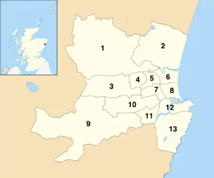 Aberdeen is divided into 13 multi-member wards, electing a total of 45 councillors. This system was introduced as a result of the Local Governance (Scotland) Act 2004, and is designed to produce a form of proportional representation.[16]
