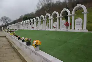 The NCB paid out £160,000 in compensation: £500 for each fatality, plus money for traumatised survivors and damaged property.[15][lower-alpha 3] Nine senior NCB staff were named as having some degree of responsibility for the accident and the tribunal report was scathing in its criticism of evidence given by the principal NCB witnesses. Lord Robens, addressing the National Union of Mineworkers in 1963 had said "If we are going to make pits safer for men we shall have to discipline the wrongdoer. I have no sympathy at all for those people—whether men, management or officials—who act in any way which endangers the lives and limbs of others."[17] No NCB staff were demoted, sacked or prosecuted as a consequence of the Aberfan disaster or for evidence given to the inquiry (one notably unsatisfactory witness had been promoted by the time Parliament debated the Davies Report);[17] Lord Robens and the board of the NCB retained their positions.[18]