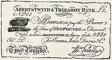 In 1815 it went into liquidation. Aberystwyth Old Bank. Messrs Jones, Davies and Williams beg to inform the public that the dissolution of their form has taken place by mutual consent, and they will feel obliged by the holders of their local notes sending them for payment to their Banking house, at Aberystwyith and those made payable in London to the House of Sir James Esdaile and Co. Aberystwyth Old bank, August 10, 1815.[8]