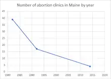 Between 1982 and 1992, the number of abortion clinics in the state decreased by 33, going from 39 in 1982 to 17 in 1992.[11] In 2014, there were 4 abortion clinics in the state.[12] In 2014, 81% of the counties in the state did not have an abortion clinic. That year, 55% of women in the state aged 15–44 lived in a county without an abortion clinic.[8] In 2017, there were 4 Planned Parenthood clinics, 1 of which offered abortion services in a state with a population of 278,104 women aged 15–49.[13]