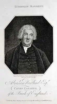 Abraham Newland (c. 1730 – 21 November 1807) was the chief cashier at the Bank of England from 1782 to 1807. The expression "an Abraham Newland" came to mean a bank note, because without his signature, a Bank of England note was not negotiable.[1]