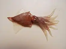 Abralia is a genus of squid comprising around 20 species from the family Enoploteuthidae. They are small squid which can be found in the epipelagic to mesopelagic zones while some species are found in water with shallow substrates on steep slopes on the boundary of the mesopelagic zone. They are distinguished from other members of the Enoploteuthidae by not normally having large, black photophores at the tips of arms IV, although if these are present they are not covered in black chromatophores,[2] and having fins which extend beyond their tail. The photophores of the integument are characteristicand are found in the three types . "Lensed" photophores are a blue color with a white ring, "simple" photophores are small and violet-colored and the "complex" photophores are surrounded by small green satellite points and have a green centre. The complex photophores will frequently appear to be blue depending on their physiological state. The integument also has small black chromatophores which look like dots.[3] They have 5-12 variably sized photophores on the eye. Either the right or left arm IV is hectocotylized.[2]