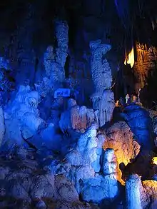 Abukuma-do (あぶくま洞 - Abukuma Cave) is a limestone cave located in Fukushima Prefecture, Japan. The cave was discovered on August 15, 1969, northeast of the city of Tamura and was originally named Kamayama Shonyu-do (釜山鍾乳洞). It was designated a natural heritage of the town on February 7, 1971, and renamed Abukuma-do on June 1, 1973.[1] Visitors can traverse a 600-metre-long path inside the cave as well as a 120-metre-long exploration course to view the stalactites and stalagmites. Each stalactite has taken more than eighty million years to form.[2] Beyond the public areas lie about 2,500 metres of cave that are not open to the public. Nearby Abukuma Cave is the smaller Irimizu Shonyu-do (入水鍾乳洞 - Irimizu Limestone Cave), discovered in 1927. Irimizu Limestone Cave was designated a National Natural Treasure on December 28, 1934.[3] The temperature inside Abukuma-do is approximately 15 °C and the humidity is above 90%.