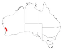 It is native to an area in the Wheatbelt region of Western Australia where it is commonly situated on plains, along the margins of swamps, in depressions and in and around saline flats growing in sandy, clay or loamy soils often containing gravel and over and around laterite.[1] It has adisjunct distribution with populations near Three Springs in the north and around Bolgart in the south where it is often part of heath or scrub communities.[2]