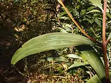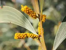 The shrub is open and spindly and typically grows to a height of 1 to 5 metres (3 to 16 ft). It blooms from July to October producing yellow flowers.[1] The main branches coming from the base are ascending to erect, crowns have sparse foliage are normally open and spreading. The bark on most branches is smooth thin and grey but it does darken and become longitudinally fissured at base of the main mature stems. The silvery to silvery blue-green phyllodes are falcately recurved over their entire length. Each phyllode is 8 to 19.5 centimetres (3 to 8 in) in length and 7 to 22 millimetres (0.3 to 0.9 in) wide. There are one or two simple inflorescences on each axil forming light golden flower spikes that are 15 to 33 mm (0.6 to 1.3 in) with flowers densely arranged within. Following flowering red-brown to dark brown linear seed pods form. Each pod is 4 to 11 mm (0.16 to 0.43 in) long and 3 to 4 mm (0.12 to 0.16 in) and are straight to shallowly curved. The seeds within are obloid and dark brown to black with a yellow anil.[2]