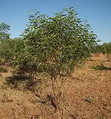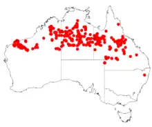 In Western Australia it is found in the Kimberley and Pilbara regions where it has a scattered distribution.[1] It is also found throughout the Northern Territory[2] extending as far east as central and south west Queensland[5][2] and into the far north east South Australia.[6][2] The shrub grows mainly on sandplains in deep red sand or sandy loam soils but also occurs along watercourses or drainage lines, and on low rocky hills or lateritic plains in often skeletal soils. It is often found in disturbed areas such as road verges.[2] It is often part of tall open shrubland communities or in low open woodlands along with species of Eucalyptus.[7]
