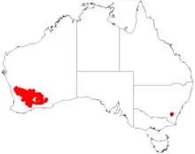 It is native to an area in the Wheatbelt and Goldfields-Esperance regions of Western Australia where it is commonly situated in salt marshes, flats and lakes and rocky hills usually growing in sandy or loamy soils and rarely in clay soils.[1] The distribution of the plant extends from Jibberding in the north west to around Lake Grace and Lake Magenta in the south east out to around Clear Streak Well in the east.[2]