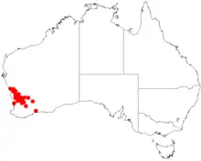 It is endemic to an area in the Mid West and Wheatbelt regions of Western Australia where it is found on sand plains growing in sandy or loamy soils over or around granite or laterite.[1]
