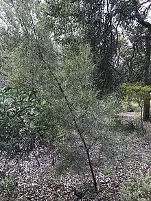 The shrub or small tree typically grows to a height of 1.8 to 7 metres (6 to 23 ft) with minni-ritchi bark and yellow flowers.[1] The silvery coloured branchlets have small silky hairs. The silvery to grey-green phyllodes have a linear to shallowly incurved shape. Each phyllode has a length of 8 to 20 cm (3.1 to 7.9 in) and a width of 1.5 to 4 mm (0.059 to 0.157 in) and also are covered with silky hairs and seven to nine raised nerves on each face. The simple inflorescences occur singly or in pairs in the axils. The obloid to cylindrical shaped flower-heads contain 43 to 49 golden coloured flowers. The flower-heads are around 7 to 15 mm (0.28 to 0.59 in) in length and with a diameter of 5.5 to 7 mm (0.22 to 0.28 in). The linear brown seed pods that form after flowering are raised over the seeds. The pods are straight to slightly curved with a length of up to 10 cm (3.9 in) and a width of 5 mm (0.20 in). The slightly glossy light to dark brown seeds within the pods have a broadly elliptic or oblong shape and are 3.5 to 4 mm (0.14 to 0.16 in) long.[2]