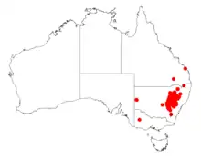 It is found on the tablelands and western slopes of the Great Dividing Range in New South Wales from Warialda in the north through to Cowra in the south as a part of Eucalyptus woodland communities growing in rocky[1] soils over and around granite or sandstone. The plant is also known in south east Queensland.[2]