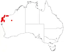 It is native to an area along the west coast in the Gascoyne, Pilbara and Mid West regions of Western Australia where it is found on sandplains, coastal hills and among limestone outcrops growing in red sandy soils[1] as a part of spinifex or in heathland communities.[2]