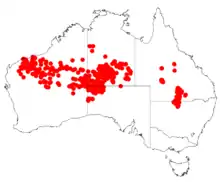 Acacia maitlandii is found in all mainland states of Australia, except Victoria,[3] and is not considered to be threatened with extinction.[2] The favoured soil type is red sand, or stony ground; the habitat is sandy or stony plains, and on hills.[2]