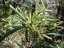 Acacia obtusifolia is an upright or spreading perennial tree which grows from 1.5m to 8m in height and it is native to Australia. It is closely related to Acacia longifolia. Acacia obtusifolia can be distinguished by it having phyllode margins which are resinous, it usually blooms later in the year and it has paler flowers than Acacia longifolia.[2] It flowers usually from December through February. Some populations of Acacia obtusifolia can survive winters to −6 °C and possibly a light snow, however plants from populations in areas that are frost free such as the coastal ranges of Northern NSW are susceptible to cold and will be killed by frosts lower than −3 °C. These populations avoid the valley floors and occur mainly on sandstone ridges well above the frost line.