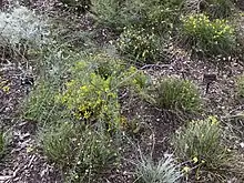 The spindly open shrub typically grows to a height of 1.5 to 3 metres (5 to 10 ft)[3] and has glabrous branchlets that can be covered in a fine white powdery coating toward the extremities and have scarring along the length by the by raised stem-projections where phyllodes once were located. Like most species of Acacia it has phyllodes rather than true leaves. The rigid, pungent, glabrous grey-green phyllodes are erect with a cylindrical shape and are straight to slightly curved. The phyllodes have a length of 1.5 to 5 cm (0.59 to 1.97 in) and a diameter of about 1 mm (0.039 in) with seven smooth longitudinal nerves.[4] It blooms in August and produces yellow flowers.[3] The inflorescences occur singly or in pairs on a raceme that is about 0.5 mm (0.020 in) in length. The obloid shaped flower-heads are 7 to 10 mm (0.28 to 0.39 in) in length and contain about 25 golden coloured flowers. The thinly leathery, glabrous seed pods that form after flowering have a powdery white coating with a linear shape but are raised over each of the seeds on alternating sides. The pods are up to 7 cm (2.8 in) in length and about 4 mm (0.16 in) wide and contain glossy black seeds with an elliptic shape that are 3 to 4 mm (0.12 to 0.16 in) long with a yellow coloured aril.[4]