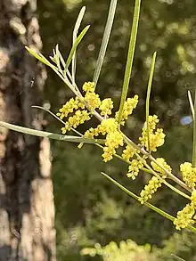 It grows to between 1 and 4 metres high and has phyllodes that are 5 to 12.5 cm long and 1 to 2 mm wide. The bright yellow globular flowerheads appear singly or in groups of two in the axils of the phyllodes from September to November, followed by curved seed pods which are 5 to 9 cm long and 2 to 4 mm wide.[3][4]
