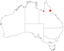 It is endemic to a small area in north eastern Queensland around Herberton, around Mount Emerald found to the south-west of Walkamin and at Stannary Hills. It is situated on steep rocky slopes, with an altitude of 780 to 880 m (2,560 to 2,890 ft) as a part of Eucalyptus woodland communities.[1]