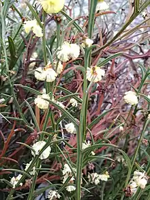 It is a rigid and prickly shrub that typically grows to a height of 0.2 to 0.7 metres (0.7 to 2.3 ft)[2] but can reach as high as 2 m (7 ft). It can have a scrambling, sprawling or tangled erect habit.[2] The shrub has ridged stems and curving spine-tipped phyllodes that form continuous wings along the stem.[3] It produces globular, cream or yellow flowerheads between March and December in the species' native range.[1][2] After flowering it will produce quadrangular seed pods that are 3 to 7 centimetres (1.2 to 2.8 in) long with prominent ridges.[3]