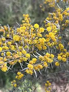 The resinous shrub typically grows to a height of 1 to 3 metres (3.3 to 9.8 ft) and has a dense to spreading habit. The sparsely to moderately hairy branchlets are commonly yellow-ribbed at their extremities. The green phyllodes have a linear or narrowly oblong-elliptic shape and can be incurved to shallowly sigmoid. The phyllodes often have a length of 1 to 3 cm (0.39 to 1.18 in) and a width of 1 to 4 mm (0.039 to 0.157 in) with two nerves per face when flat.[2] It blooms between August and November producing yellow flowers.[3] The simple inflorescences appear singly or in pairs on racemes with an axis that is around 1 mm (0.039 in) in length. The spherical flower-heads usually contain 17 to 22 light golden flowers. The seed pods that form after flowering are strongly curved to openly coiled and sometimes twisted. The pods are around 6 cm (2.4 in) in length and have a width of 2 to 3 mm (0.079 to 0.118 in) and contain oblong seeds.[2]