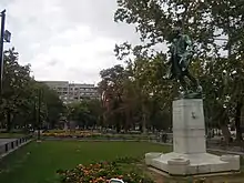 The market continued to operate until 1926 when was finally closed and its area was used to enlarge the Pančič's Park in 1927, when the present square was finally formed, with the park in the central part. The project was done by Đorđe Kovalevski. In 1929, the stone ornamental fence with the massive gates made of wrought iron was built around the park, projected by Milutin Borisavljević. It was projected in the style of Classicism with Neo-Baroqe and Rococo motives. The fence and the gates cost seven time more than the construction of the enlarged park itself two years ago. The fence has 74 decorative oval alcoves with ornamental wrought iron flower ornaments. It also has 176 decorative amphora-shaped vases, ornamented with the motives of ram heads and garlands. The fence and the ornaments are made of reinforced concrete with artificial stone covering. In 1930, the monument to Dositej Obradović (work of Rudolf Valdec) was transferred to the park from his previous location at the end of the Knez Mihailova street, where it was unveiled in 1914. A monument to Jovan Cvijić, sculptured by Oto Logo, was dedicated in 1994.[2][3][5][7][10]