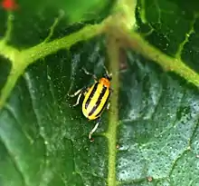 In the United States, two species are major pests of cucurbits, the striped cucumber beetle (Acalymma vittatum), which is mainly found east of the Mississippi River, and Acalymma trivittatum which is mostly found west of the Mississippi.[2] Adults feed on young leaves, and larvae can damage roots.[3] A. vittatum vectors bacterial wilt Erwinia tracheiphila Holland (Enterobacteriales: Enterobacteriaceae) to the plants as it pierces plant stems to suck juices.[4]