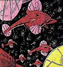 The Acanti are large space-faring creatures most closely resembling Earth's whale shark. They are a reddish-brown color. They have dorsal, ventral, lateral, and caudal fins, as well as green eyes widely spaced on their heads. An adult Acanti can grow to a few kilometers in length, and even an infant is large enough to swallow a 15-person spaceship with room to take in at least four more. They are sentient creatures which communicate through psionic sounds referred to as songs. Acanti have the innate ability to fly faster than the speed of light, without technological assistance.