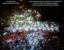 - Various forms of acarinaria have evolved within different lineages of carpenter bees, in the Old World subgenera Koptortosoma and Mesotrichia - in some cases, the entire anterior portion of the metasoma is hollowed out into an enormous internal chamber, entered through a small opening on the face of the first metasomal tergite, in which the mites can travel. Some species in these groups also have supplementary acarinaria on the mesosoma in addition to the metasomal chamber.