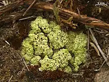 Acarospora schleicheri, the soil paint lichen, is a bleached to bright yellow areolate to squamulose lichen that commonly grows to 10 cm (4 in) on soil (terricolous) in arid habitats of southern California and Baja California, also in Europe and Africa.[2]: 218 [3] It produces rhizocarpic acid as a secondary metabolite,[3] which gives it a yellow coloration and serves to protect it from the sun.[4] Its lower surface is also yellow.[3] It can be greenish when moist.[2] Roundish, angular, or irregularly shaped squamules are 0.5–4 mm in diameter.[3] There are 0–1 (sometimes 2–3) apothecia embedded in the thallus, with 0.4–1.2 mm roundish black to reddish-brown,[3] or dark brown[2] discs, which sometimes fill the areola so as to be lecanorine.[3] It divides vegetatively on the soil.[3] Asci are club shaped (clavate) and have 100 or more spherical to ellipsoid spores.[3] Lichen spot tests are negative, and it is UV+ orange under ultraviolet light.[2]: 218