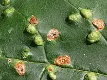 Mites form numerous capsule galls, greenish-yellow in color, between leaf veins of Ash trees in the genus Fraxinus, including Fraxinus americana, Fraxinus latifolia, Fraxinus nigra, and Fraxinus pennsylvanica.[3][4] The mites stay in the galls until late summer when host leaves mature.[5]:50