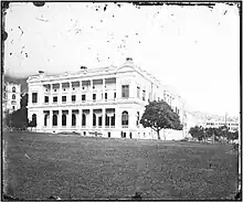 Work on the huge Saigon Governor's Palace began in earnest when Hermitte brought in skilled workmen from Canton and Hong Kong. The site of the Palais du Gouverneur turned out to be waterlogged and the foundations required constant repair to counteract subsidence throughout the building's life.[12] Most of the materials were imported from France, adding to the cost.[13] Completion of construction was celebrated informally on 25 September 1869 with a banquet and a ball for everyone involved in the project.[12] The final, formal opening of the palace took place in 1873 under Governor Marie Jules Dupré.[13] Dupré moved into the building that year, and the decorations were completed in 1875. The total cost was 12 million francs, over a quarter of the budget for public works in Cochinchina.[14]