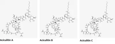 Aciculitins are antifungal cyclic peptides isolated from a marine sponge. There are 3 Aciculitins that are isolated from the Lithistid sponge Aciculites orientalis that differ by their homologous lipid residues.[1]
